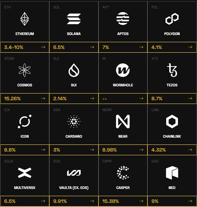 Stake ETH, MATIC, SOL, ATOM, DOT, AVAX, and more